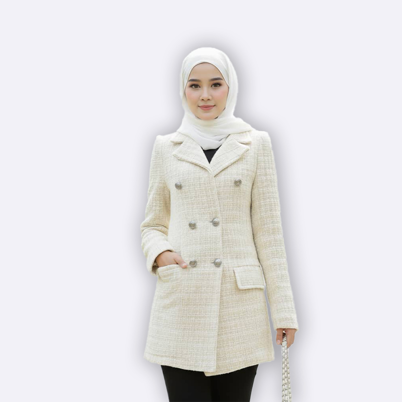 تألقي بأناقة مع هذا المعطف التويد المزدوج الصدر. تصميم كلاسيكي يضفي لمسة من الرقي على إطلالتك، ويحميك من برودة الطقس.