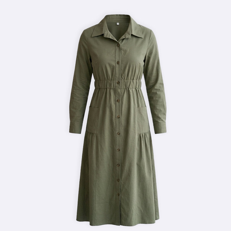 جاكيت طويل بتصميم فستان يتميز بخصر مطاطي وجيوب جانبية مع ياقة كلاسيكية وأزرار أمامية كاملة