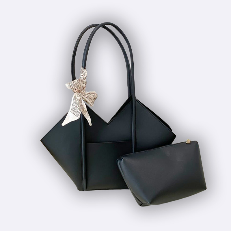 حقيبة يد كبيرة ذات تصميم هندسي عصري وزوايا مدببة، تأتي مع وشاح صغير مزخرف مربوط بالمقبض وحقيبة داخلية أو خارجية صغيرة مطابقة، ومناسبة للاستخدام اليومي أو للعمل.