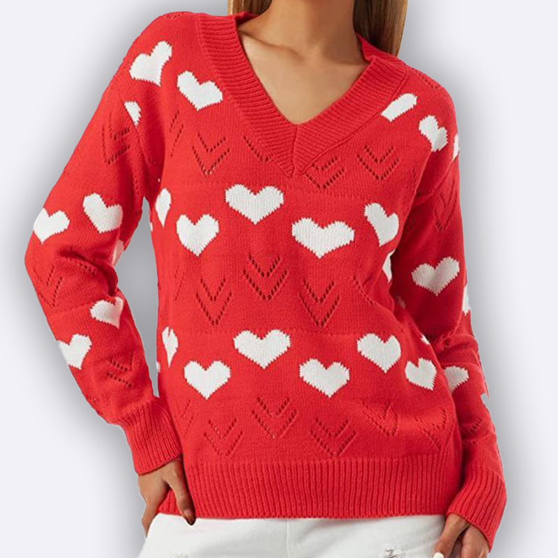 كنزة صوفية محبوكة بياقة واسعة على شكل حرف V، تتميز بنقشة قلوب كبيرة، مناسبة للإطلالات الشتوية والمناسبات غير الرسمية.