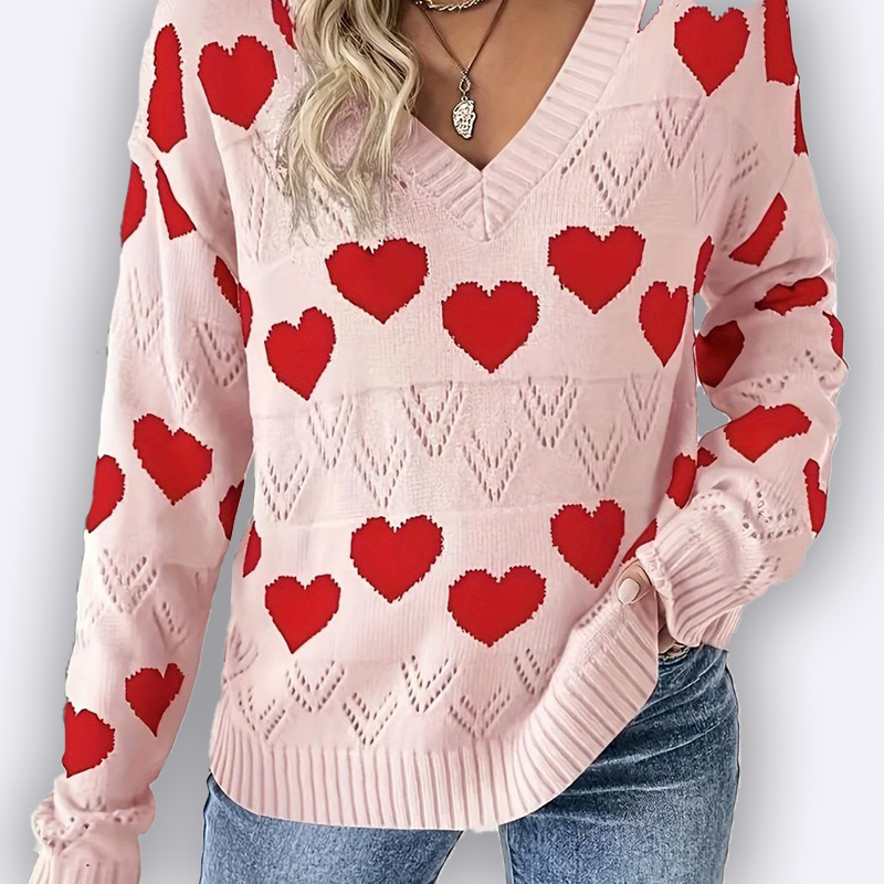 V-Neck Heart Pattern Knit Sweater