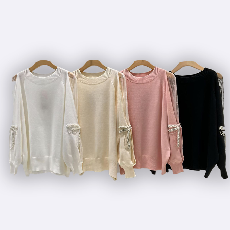 كنزة علوية محبوكة بياقة مستديرة، تتميز بأكمام طويلة منتفخة من قماش شبكي (دانتيل/مُطرز) وتفاصيل فيونكات مزينة بالخرز والترتر على الأكمام، وتصميمها أنيق ومناسب للإطلالات المسائية أو المناسبات المميزة.