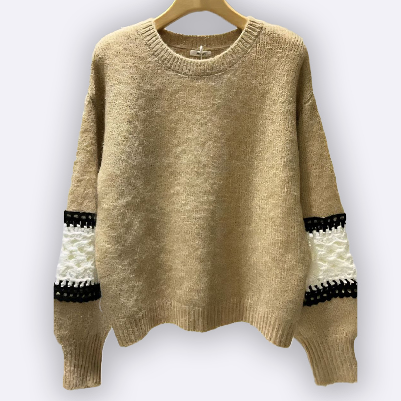 كنزة صوفية محبوكة بياقة مستديرة وتصميم مريح، تتميز بأكمام طويلة مزينة بقطعة كروشيه شبكية مفتوحة عند المعصم، مما يمنحها لمسة عصرية وفنية، ومناسبة للإطلالات الشتوية والربيعية.