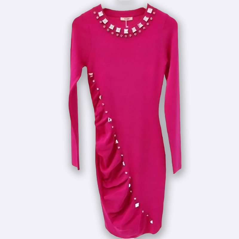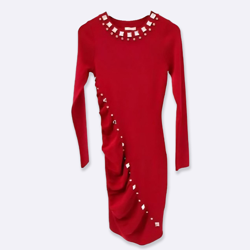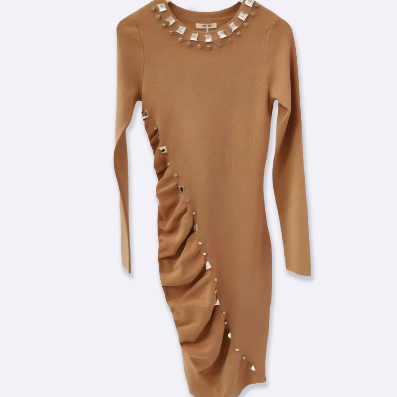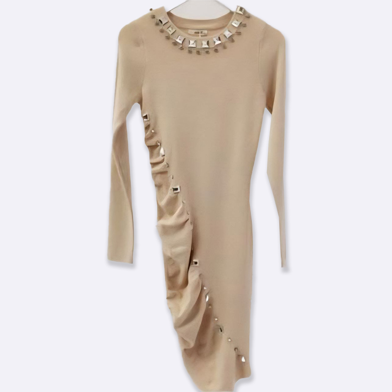 تألقي بإطلالة ساحرة مع هذا الفستان الميدي الضيق، المصمم بكسرات أنيقة وتفاصيل حجر الراين البراقة. مثالي للمناسبات الخاصة والسهرات.