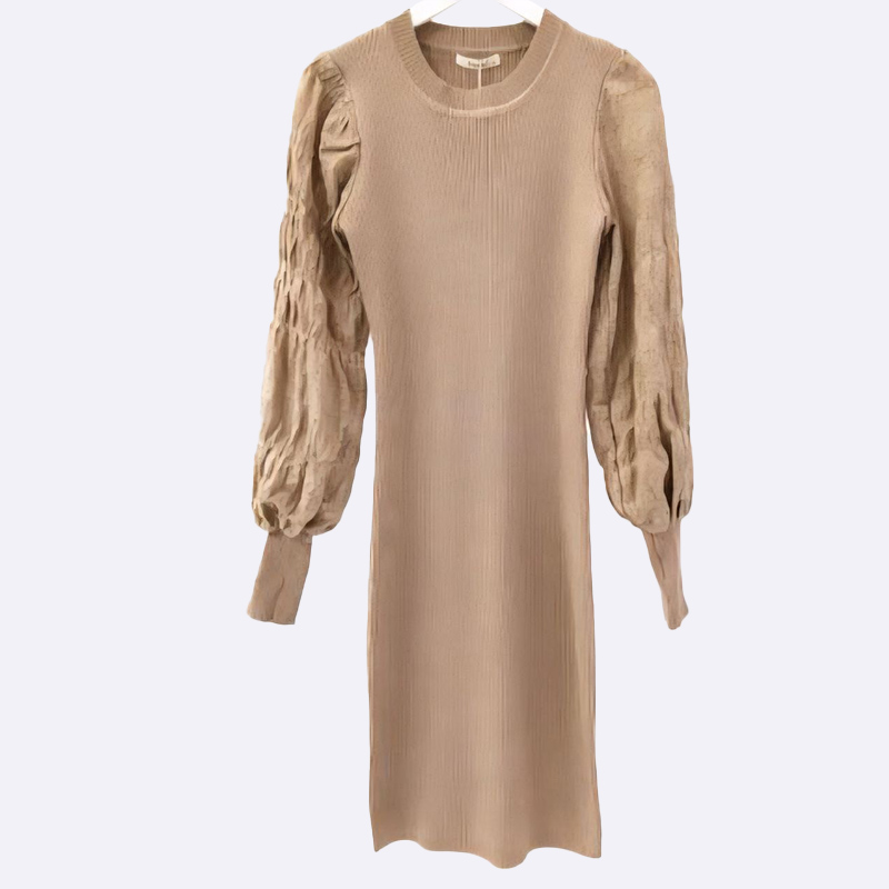 تألقي بإطلالة عصرية مع هذا الفستان الضيق المضلع. يتميز بأكمام بالون شفافة تضفي لمسة أنيقة وجذابة. مثالي للمناسبات الخاصة والسهرات.