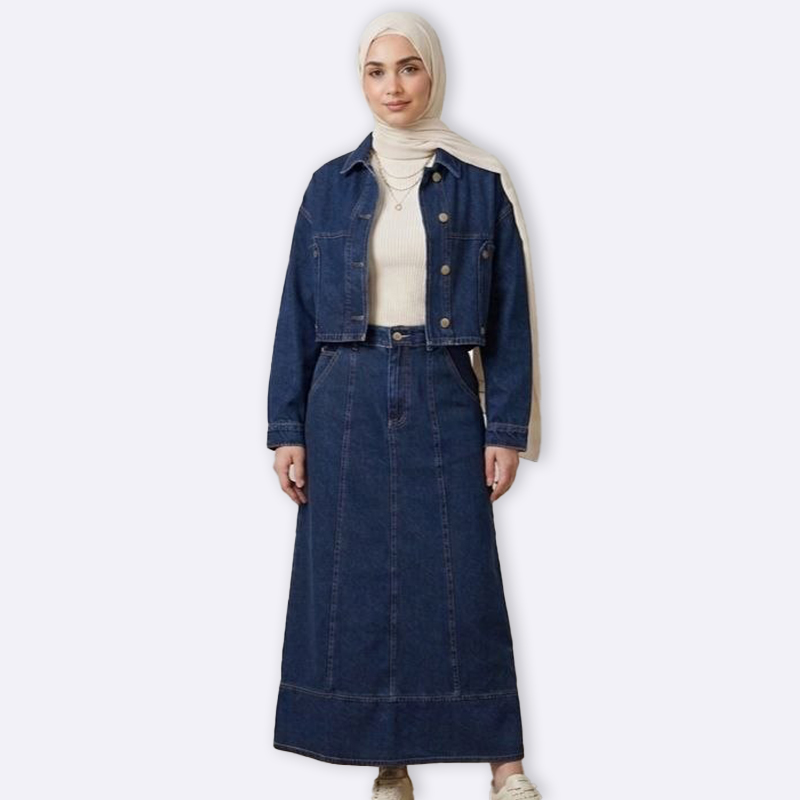 طقم عصري يتكون من جاكيت جينز قصير مع تنورة طويلة متطابقة بتصميم عملي وأنيق.
