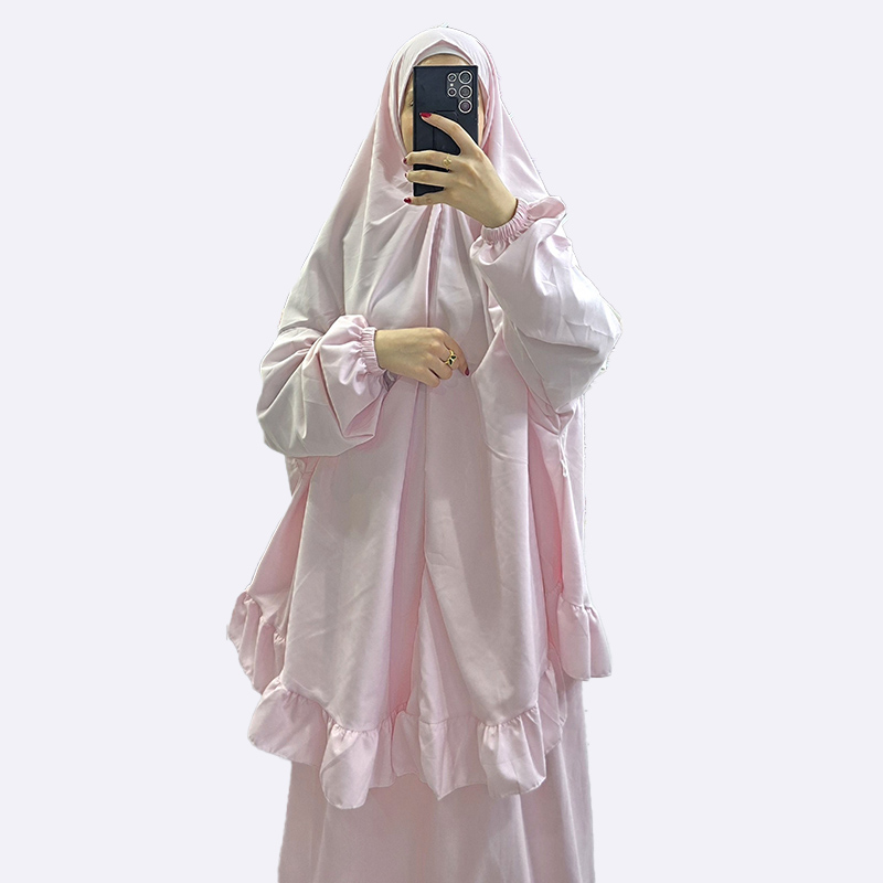 طقم صلاة نسائي متكامل من قماش التترون الخفيف، يتميز بتصميم سادة بسيط وحافة سفلية مزينة بكشكشة ناعمة، ويوفر تغطية كاملة ومريحة مع أساور مطاطية.