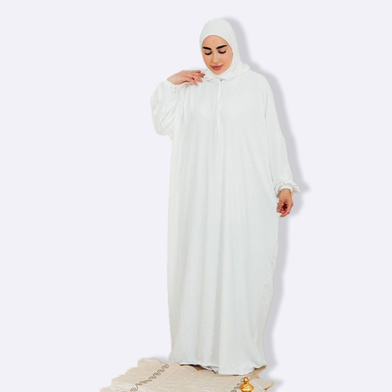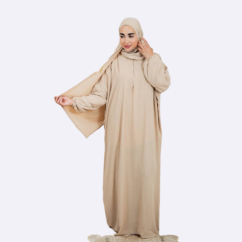 عباية فضفاضة ومريحة من قماش ذي ملمس منسوج، تأتي مع شال مطابق، وتتميز بأكمام واسعة وأساور مطاطية لتغطية كاملة وأنيقة.