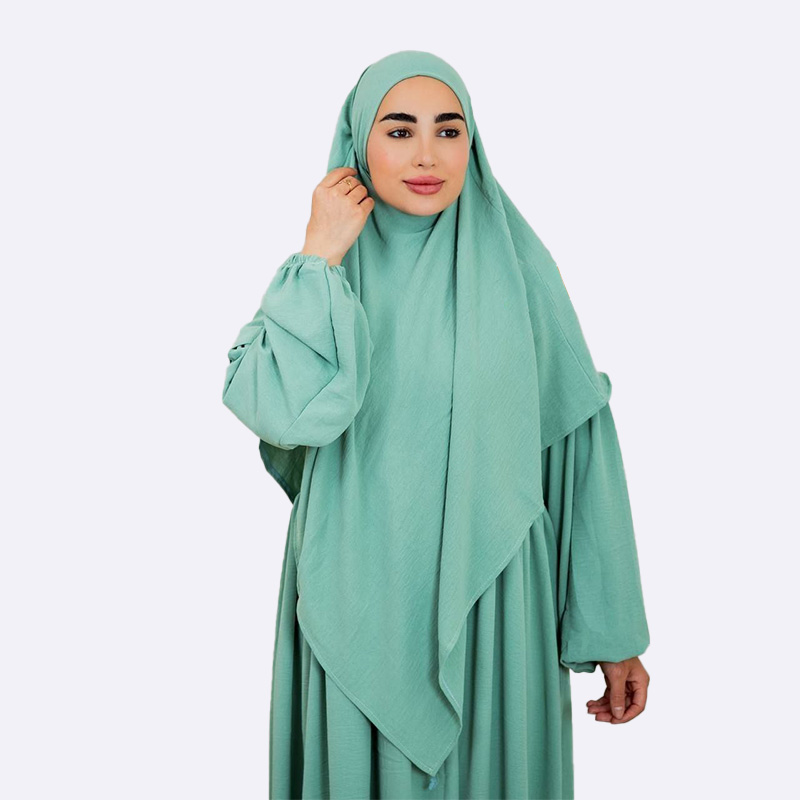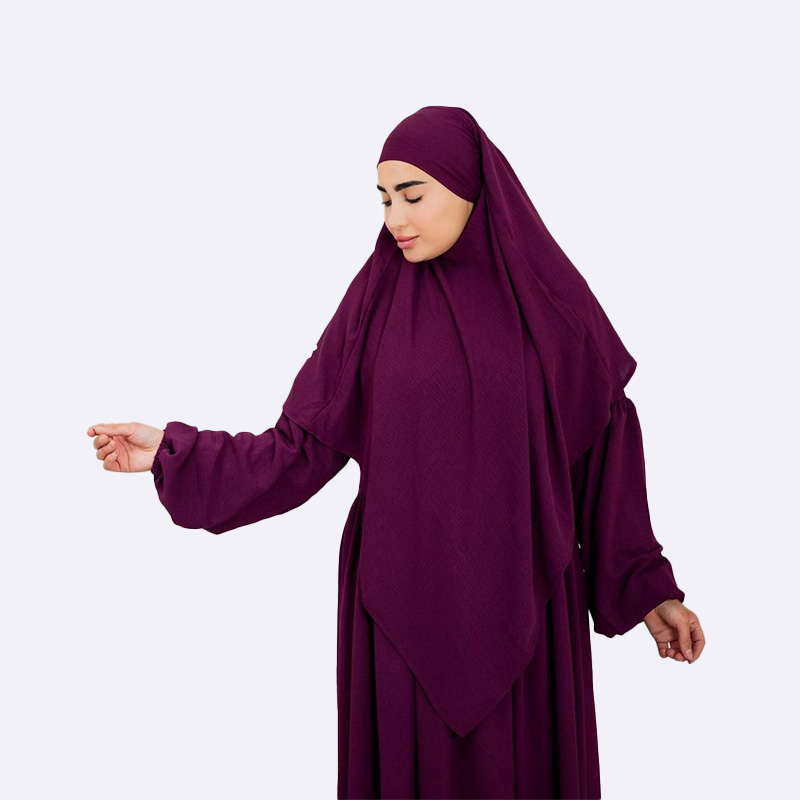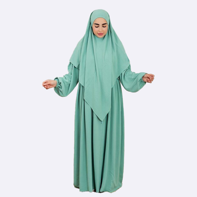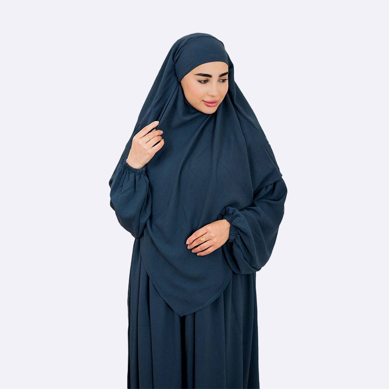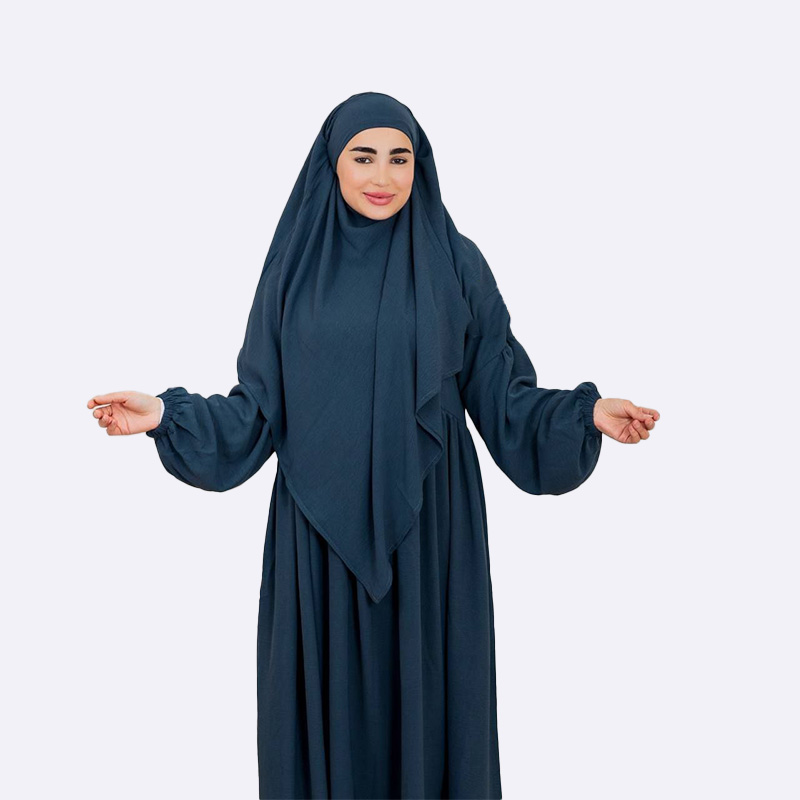 إسدال صلاة أو لباس شرعي واسع وفضفاض بتصميم سادة، مصنوع من قماش خفيف ومريح ويوفر تغطية كاملة، ويأتي مع غطاء رأس متصل أو مطابق.