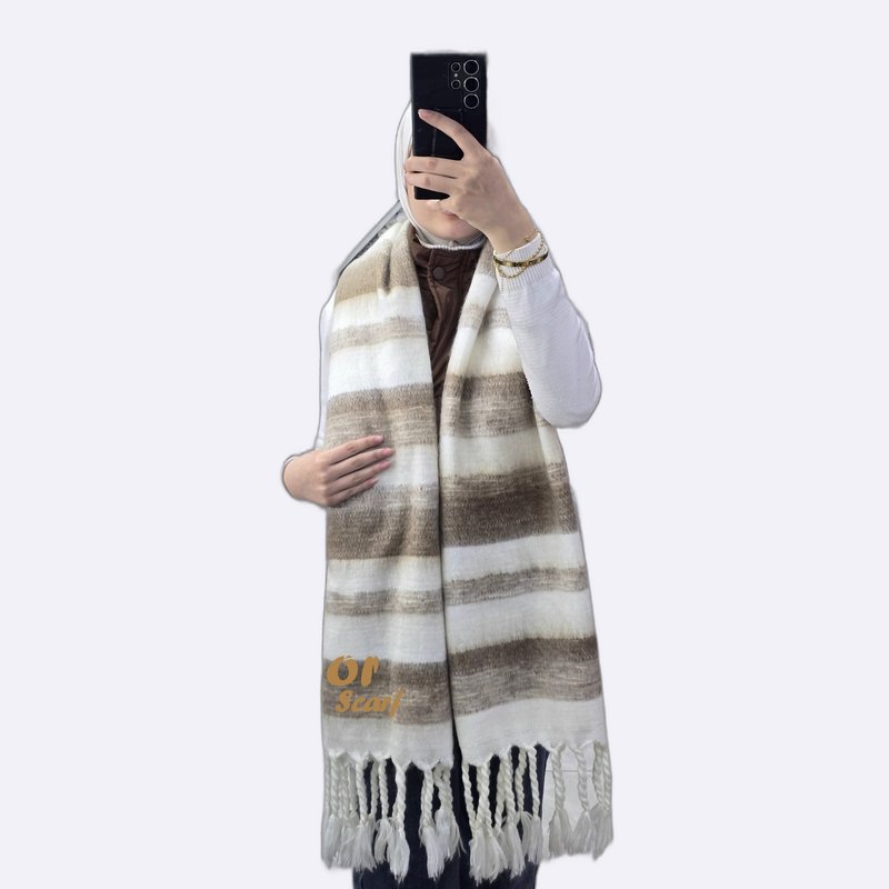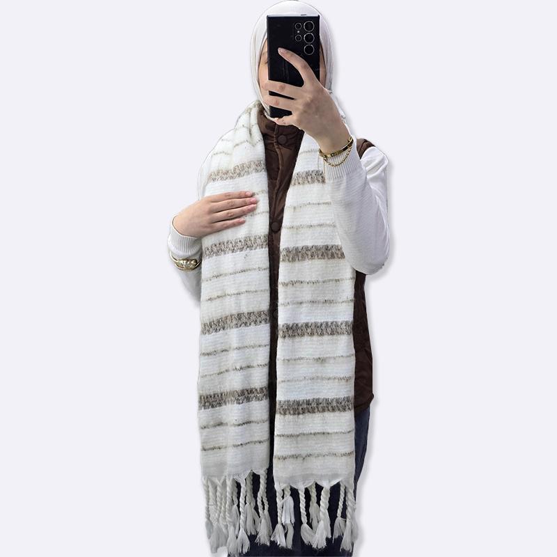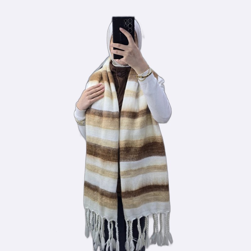 شال دافئ بنقشة خطوط عرضية وتفاصيل شراشيب، يجمع بين المظهر العصري والملمس الغني.