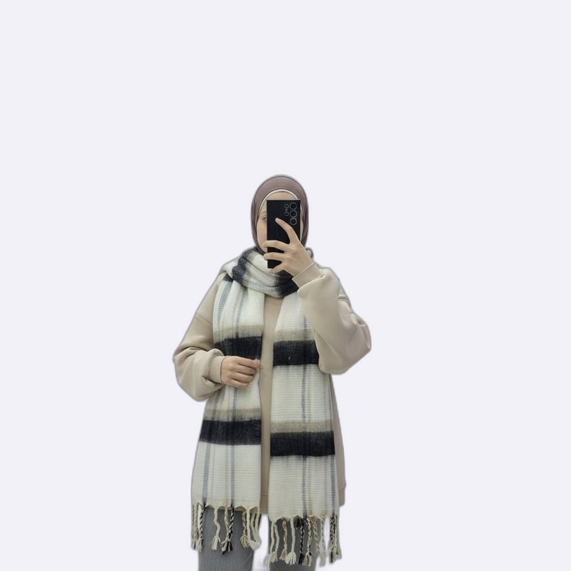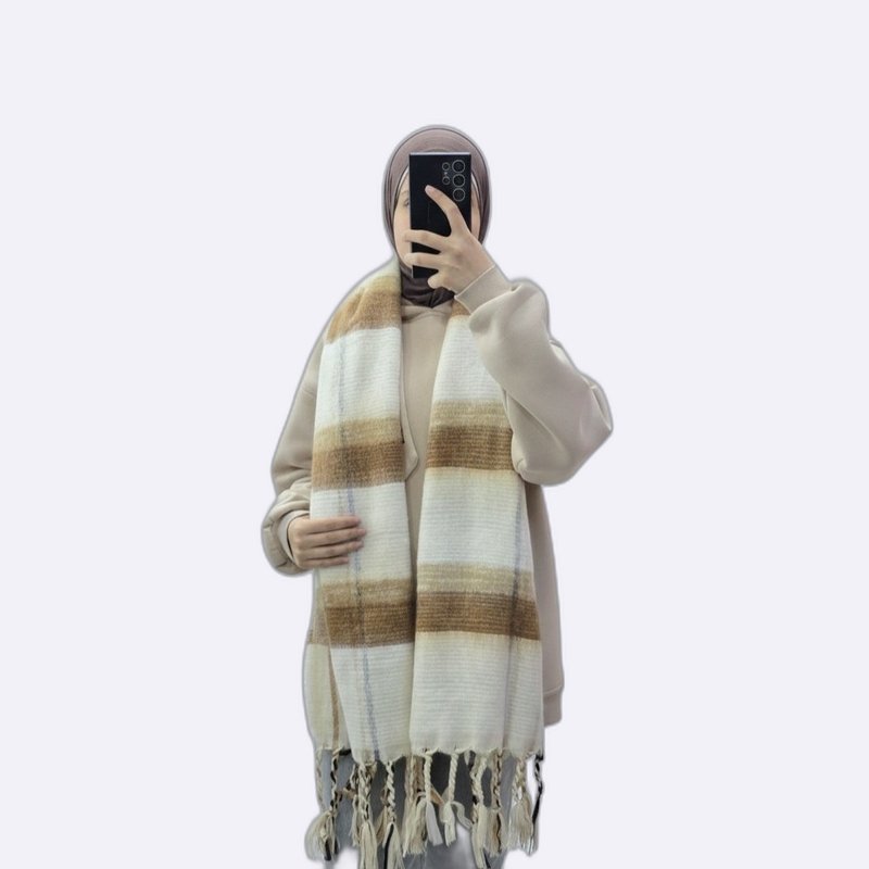 شال دافئ بنقشة خطوط عرضية وتفاصيل شراشيب، يجمع بين المظهر العصري والملمس الغني.