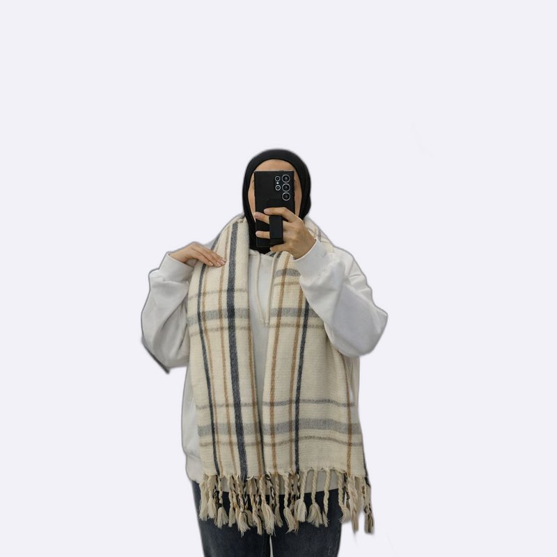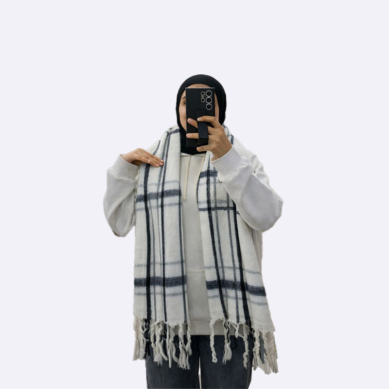 شال دافئ بنقشة خطوط عرضية وتفاصيل شراشيب، يجمع بين المظهر العصري والملمس الغني.