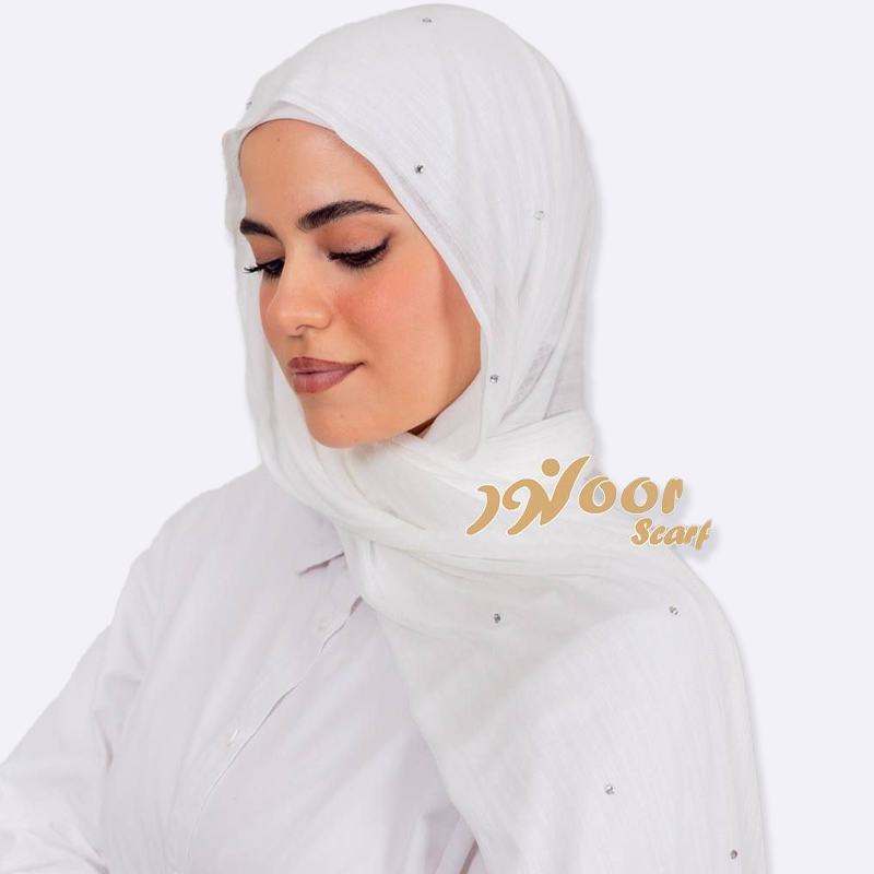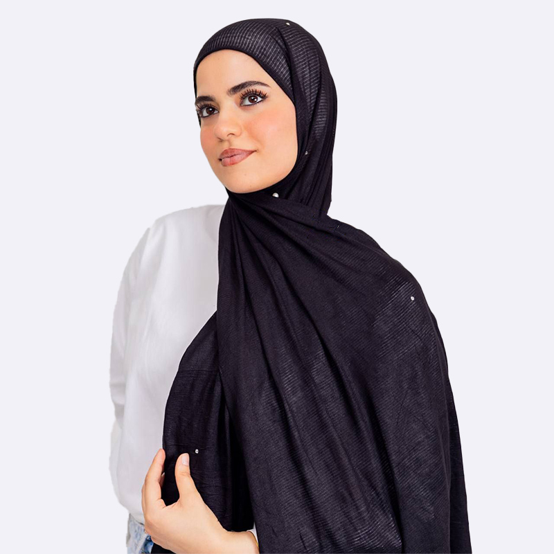 حجاب كويتي راقٍ مزين بحبات اللؤلؤ الصغيرة (اللولوا) التي تضفي لمعة كالألماس، يتميز بخامة خفيفة وعملية تناسب الإطلالات اليومية والمناسبات.