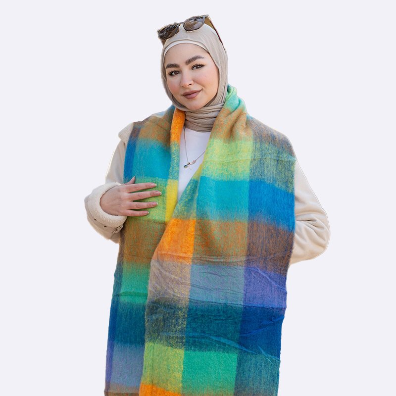 أضف لمسة من الألوان إلى مظهرك مع هذا الوشاح الكاروهات الجميل بألوان قوس قزح. تصميم عصري ودافئ مثالي لأيام الشتاء.
