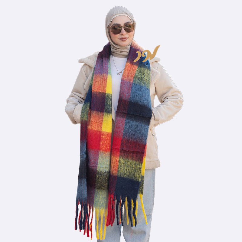 أضيفي لمسة من الألوان إلى إطلالتك مع هذا الوشاح المربع بنقشة قوس قزح. تصميم عصري ودافئ مثالي لأيام الشتاء الباردة.