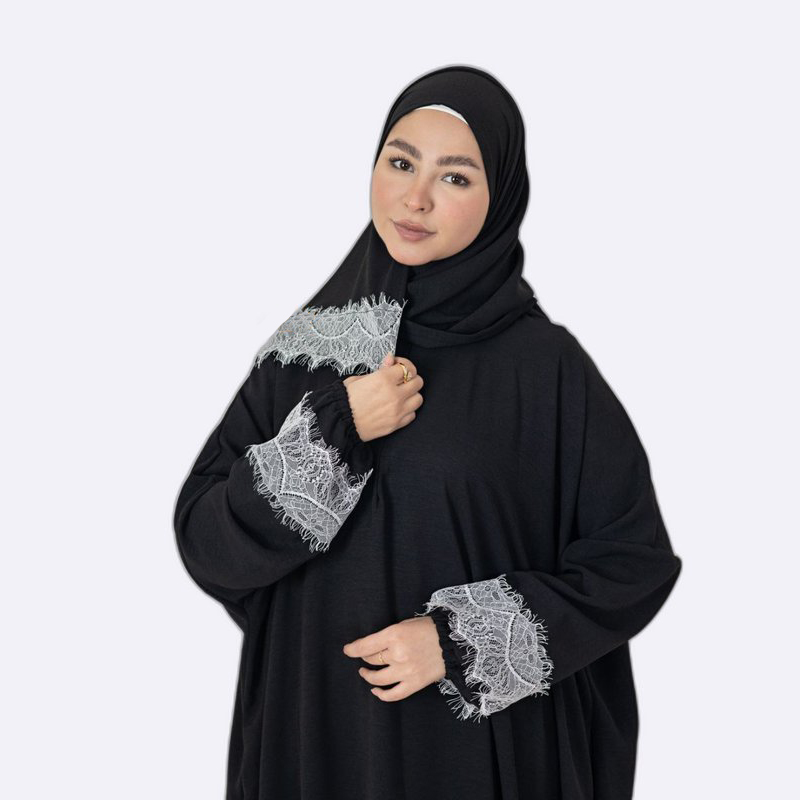 تألقي بأناقة مع طقم العباية الفاخر بتطريز الدانتيل الرقيق. تصميم عصري ومريح يضفي لمسة من الجمال والرقي على إطلالتك.