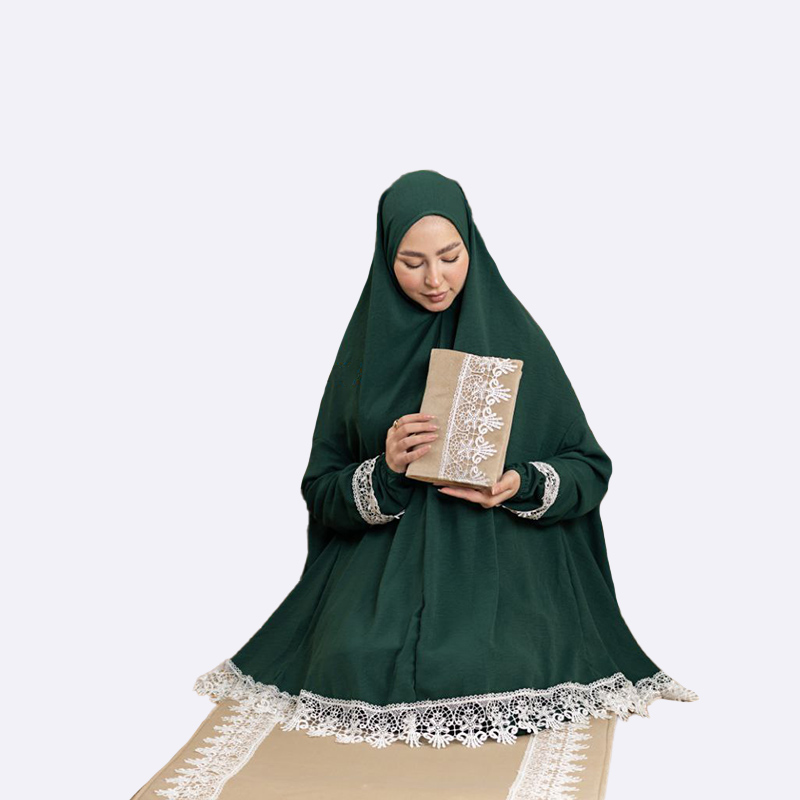 استمتعي بأناقة وراحة لا مثيل لهما مع طقم الصلاة المتكامل. يتميز بتصميم عصري ولمسة من الدانتيل الرقيق، ليضفي جمالًا على لحظات عبادتك, سجادة صلاة مخمل مع دانتيل منجدة بسماكة 2 سم مع بيت مصحف نفس السجادة