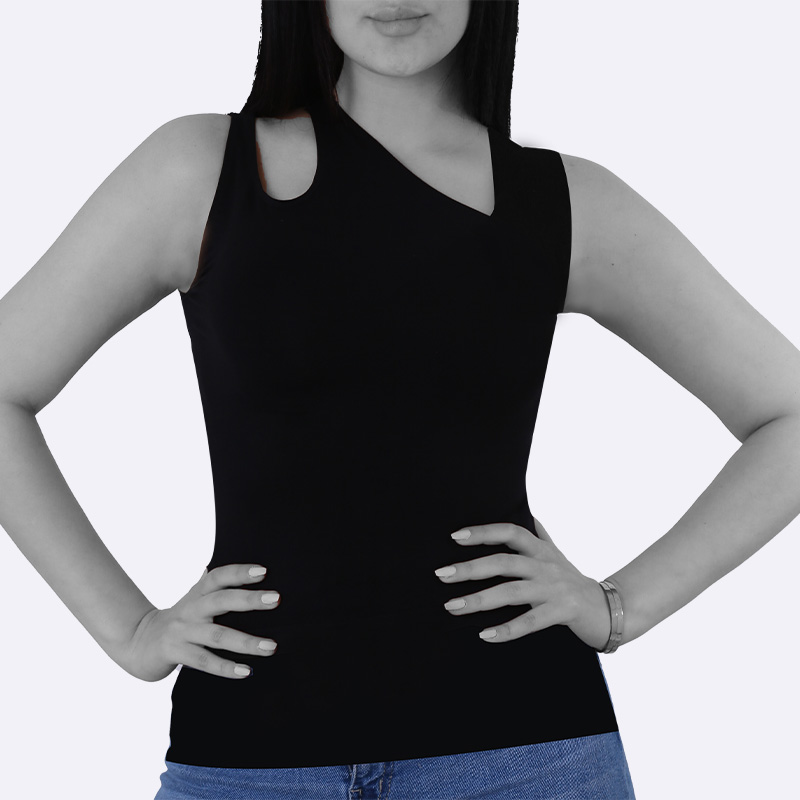 توب نسائي باللون الأسود بتصميم عصري يتميز بقصة حفر غير متماثلة عند الكتف والرقبة مع فتحة جريئة (Cut-out)، مما يجعله قطعة مميزة وأنيقة.