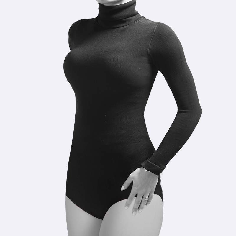 بودي سوت نسائي ضيق باللون الأسود، يتميز بأكمام طويلة وياقة عالية مطوية (Turtleneck)، وهو مثالي كقطعة داخلية أو للارتداء مع التنانير والسراويل.