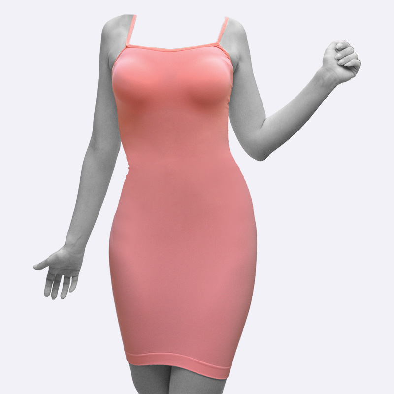 فستان نسائي قصير وناعم باللون المرجاني/الخوخي، بتصميم ضيق وحمالات كتف رفيعة (Spaghetti Straps)، مثالي للارتداء تحت الملابس الشفافة أو بمفرده كفستان صيفي خفيف.