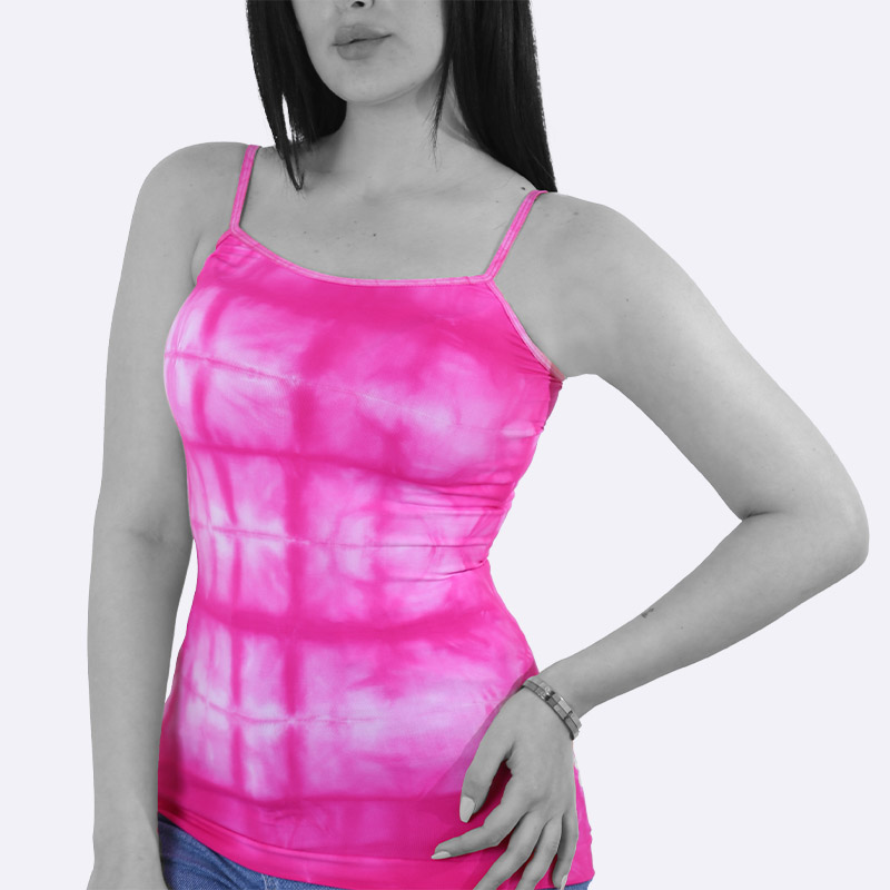 توب نسائي أساسي باللون الفوشيا والأبيض، يتميز بحمالات كتف رفيعة (Spaghetti Straps) ومطبوع بنقشة التاي داي (Tie-Dye) العصرية، مثالي للارتداء الصيفي.
