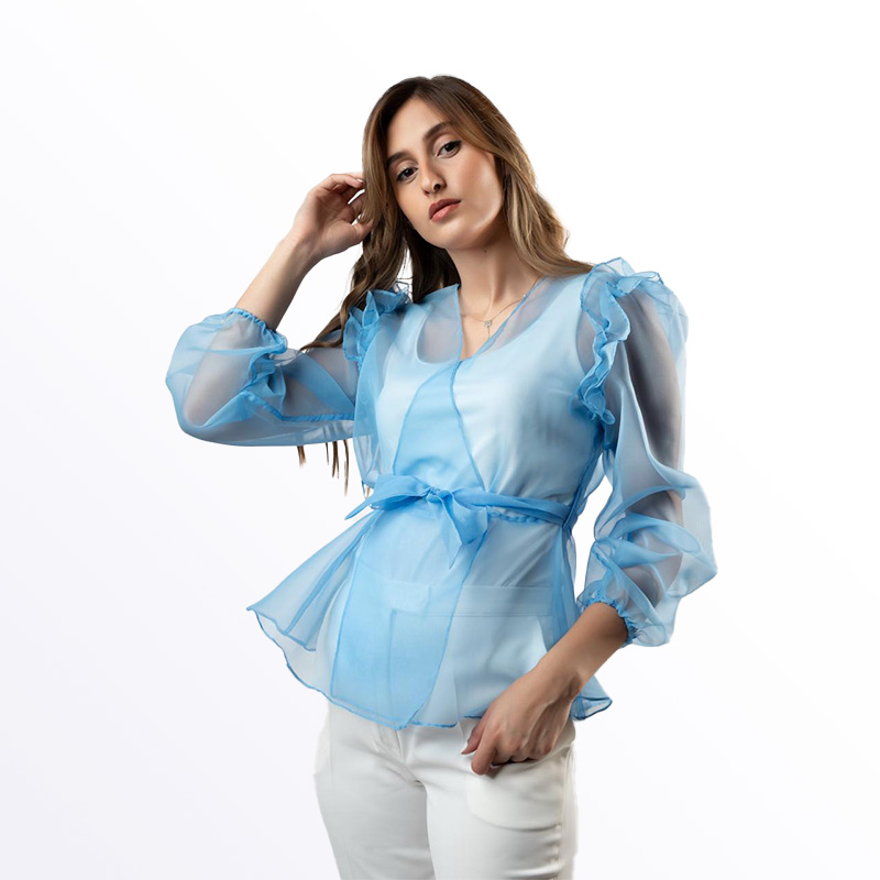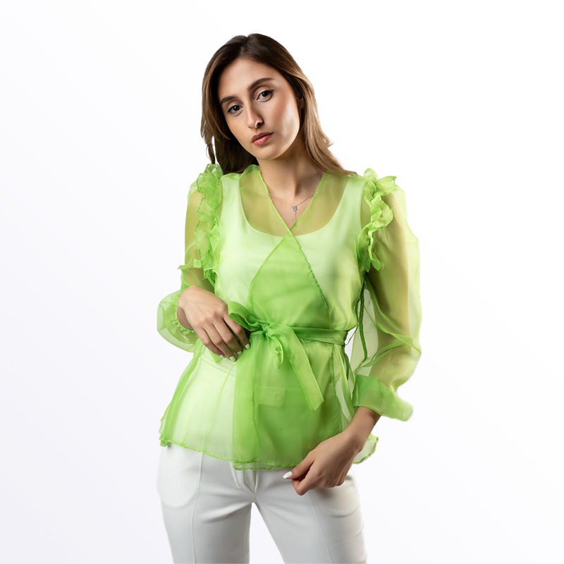 لوزة نسائية أنيقة بتصميم لف، مصنوعة من قماش شفاف ومتوفرة بألوان متنوعة تشمل الأبيض، الكيوي (الأخضر الفاتح)، الأزرق، والأصفر. تتميز بكشكشة (كَرانيش) على الأكتاف وحزام قماش لربطها عند الخصر لإطلالة عصرية وجذابة.