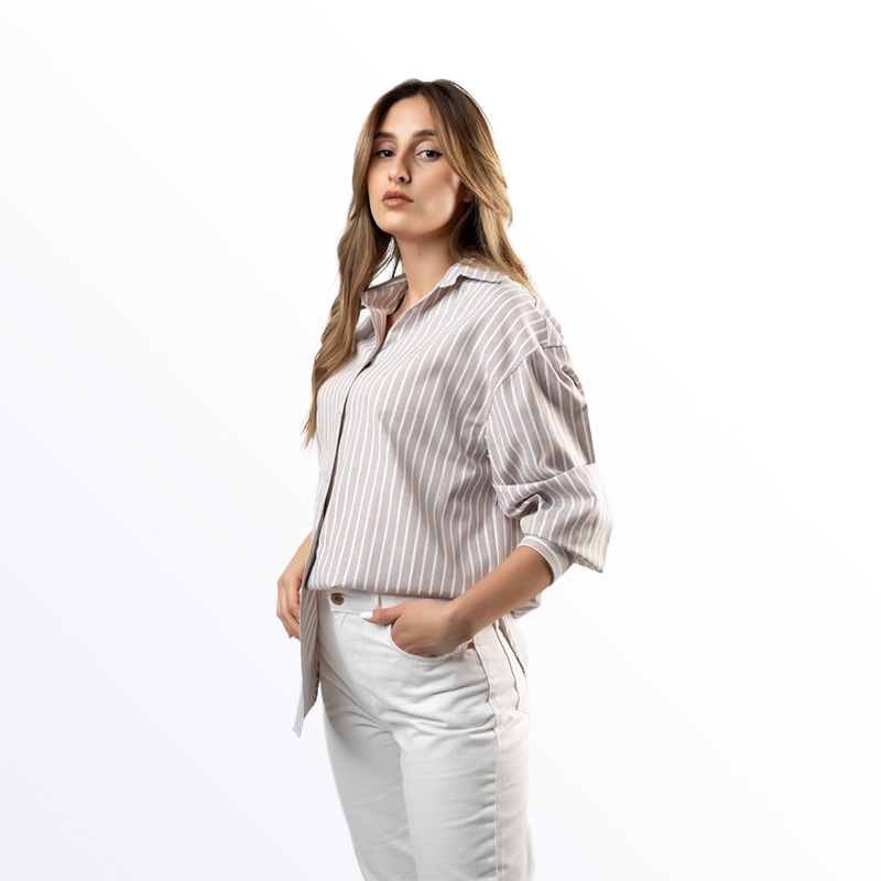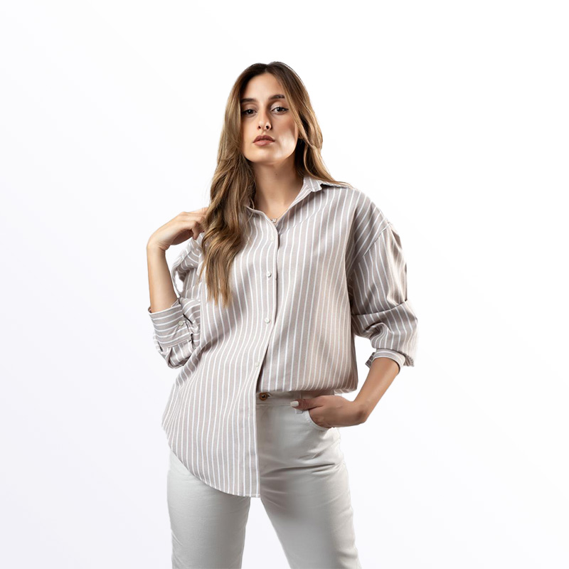 ميص نسائي أنيق بقصة فضفاضة ومخطط باللون الأزرق الفاتح والأبيض. متوفر بألوان إضافية تشمل الأخضر، البيج الفاتح، والأزرق. يمكن ارتداؤه مفتوحًا كسترة خفيفة أو مغلقًا لإطلالة كاجوال مريحة.