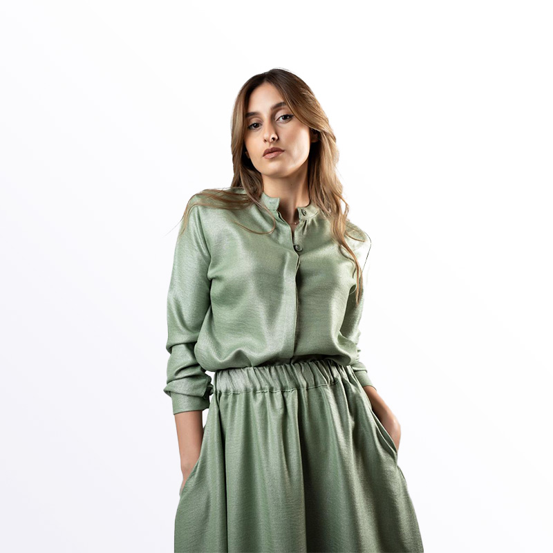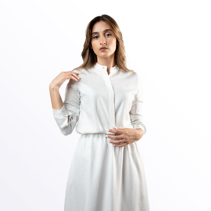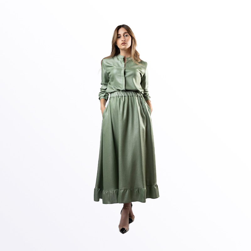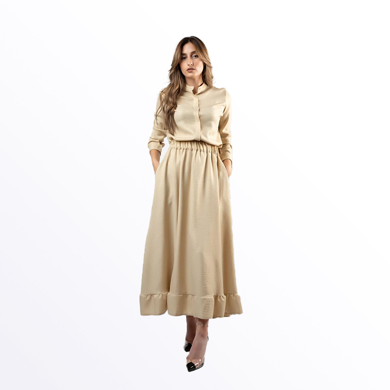 طقم نسائي أنيق مكون من كنزة وتنورة طويلة بقصة واسعة. يتميز بتصميمه الراقي وألوانه الجذابة مثل الأبيض، البيج الفاتح، الذهبي، والأخضر، مما يجعله خيارًا مثاليًا للمناسبات الرسمية والعائلية.