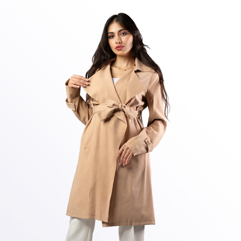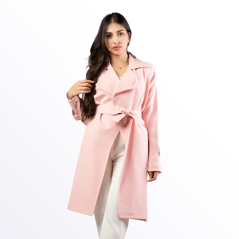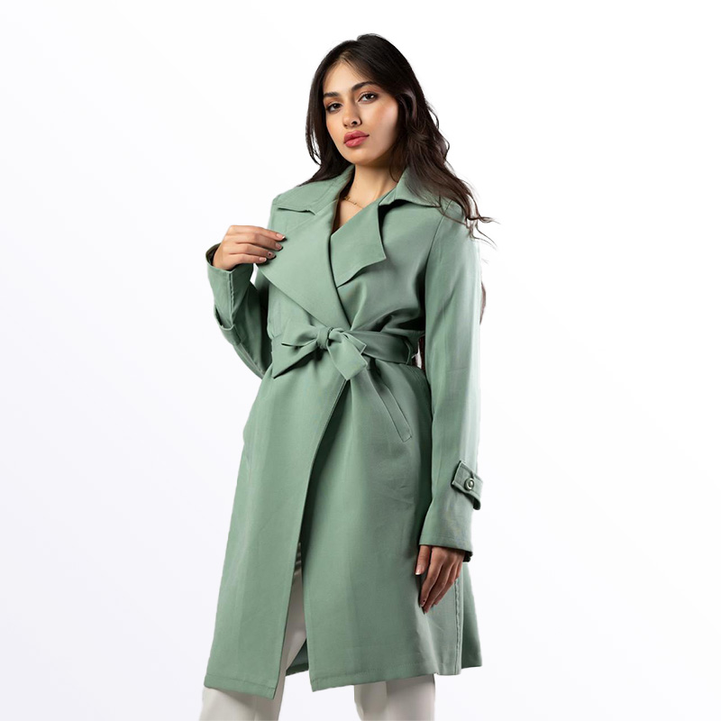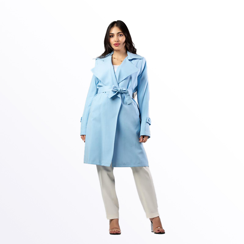 معطف نسائي أنيق بتصميم عصري ولون سماوي جذاب، يتميز بحزام على الخصر قابل للربط لإظهار القوام. يتوفر بألوان مميزة تشمل الأخضر، البيج الفاتح، الزهري الفاتح، والسماوي، مما يجعله قطعة أساسية للموسم الانتقالي.