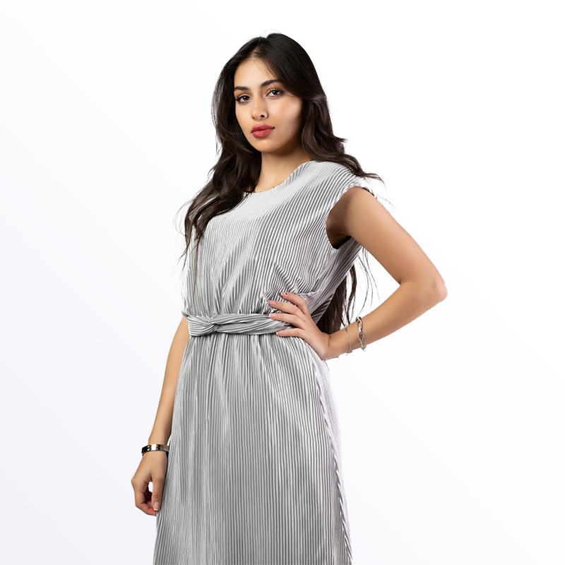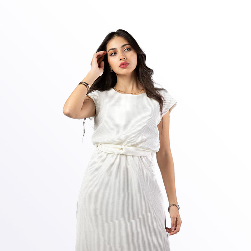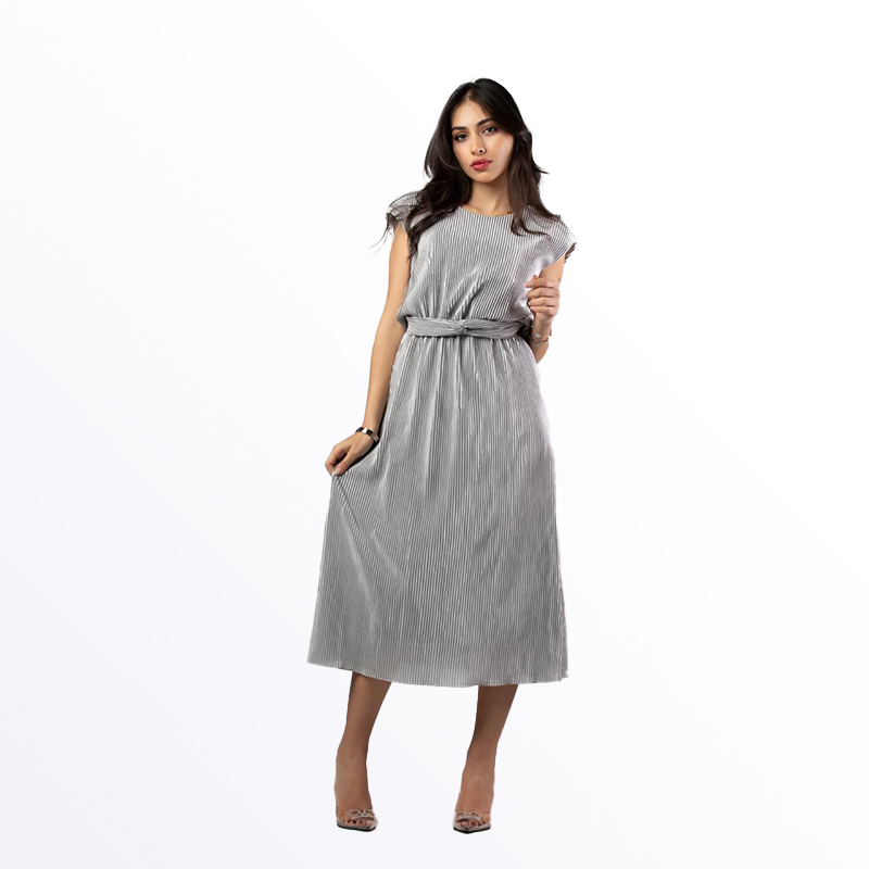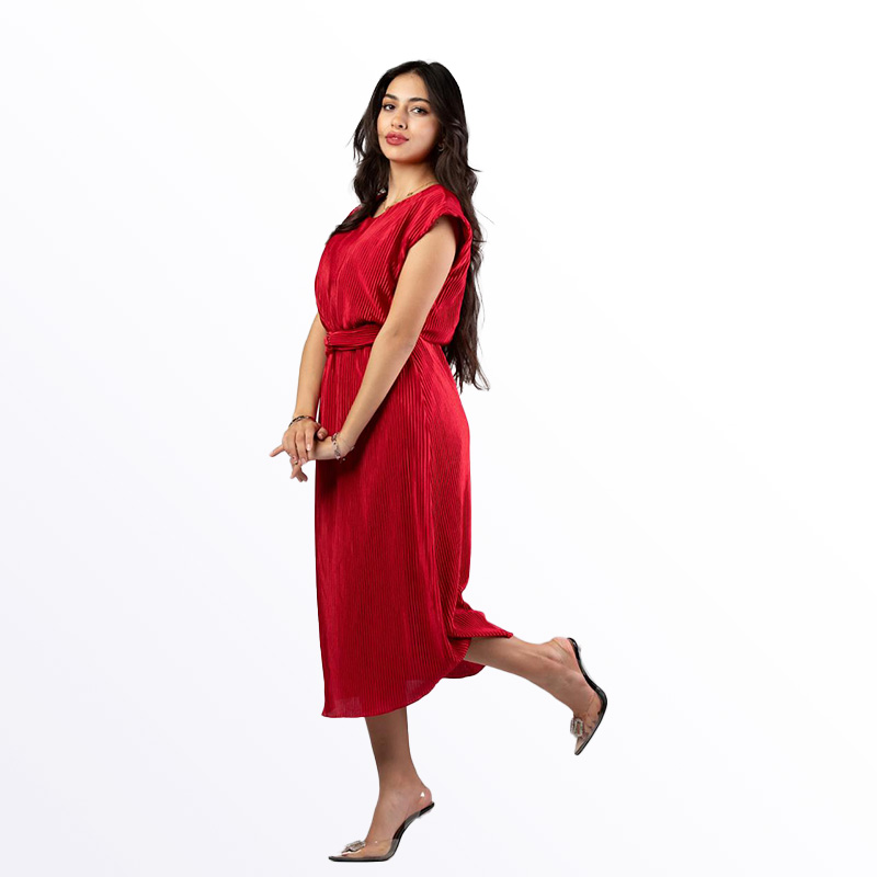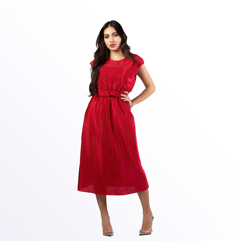 فستان سهرة نسائي بتصميم أنيق وقماش بليسيه، مزود بحزام قماشي عند الخصر لإبراز القوام. يتوفر بألوان جذابة تشمل الزهري الغامق، الأحمر، الأبيض، والفضي، مما يجعله خيارًا مثاليًا للمناسبات الخاصة والسهرات.