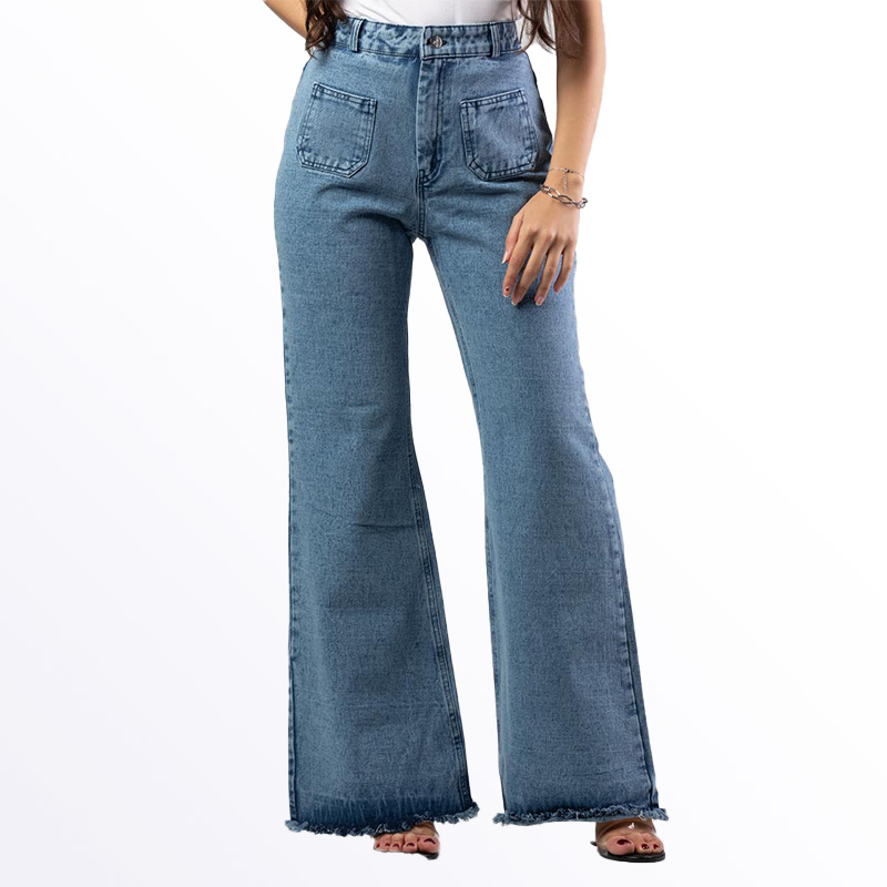 بنطال جينز نسائي بقصة واسعة على شكل جرس، ويتميز بخصر مرتفع وواسع، وجيوب أمامية كبيرة. يتميز بلمسة نهائية مفرّغة عند الأطراف السفلية، مما يجعله خيارًا عصريًا ومناسبًا للارتداء اليومي.