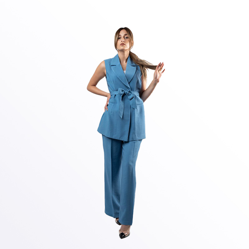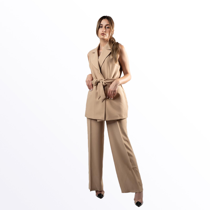 طقم رسمي نسائي مكون من جاكيت بدون أكمام وبنطال بقصة مستقيمة، بلون بيج غامق. يتميز الجاكيت بحزام قماشي عند الخصر قابل للربط، مما يجعله خيارًا أنيقًا وعصريًا للمناسبات الرسمية والعمل. يتوفر أيضًا باللونين البترولي والأخضر.