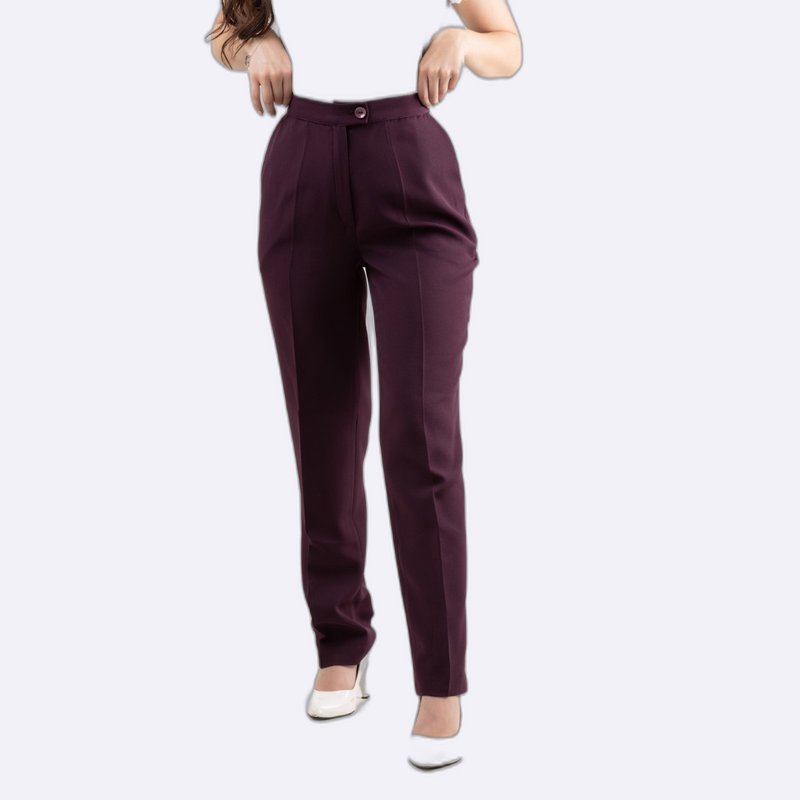 بنطلون رسمي بخصر مرتفع وتفاصيل ثنية أمامية، بقصة مستقيمة وضيقة قليلاً مثالي لإطلالات العمل.