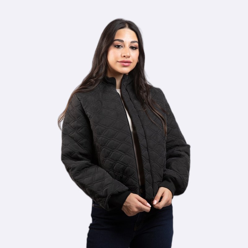 جاكيت قصير بومبر مبطن بنمط ماسي، بياقة وأساور مطاطية وزر إغلاق أمامي، مناسب لإطلالات الكاجوال.