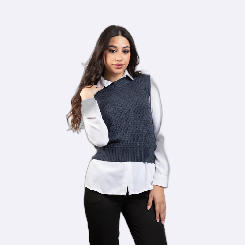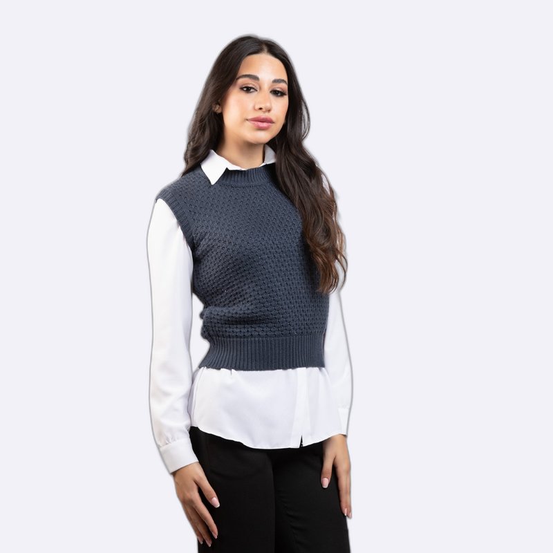 سترة (فيست) صوفية محبوكة بقصة قصيرة وياقة على شكل حرف V، مثالية للارتداء فوق قمصان أساسية.