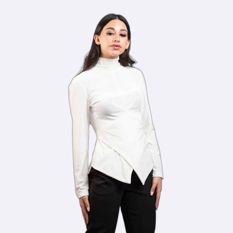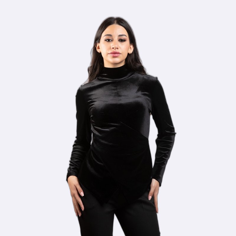بلوزة سهرة نسائية أنيقة بأكمام طويلة وياقة عالية (Mock Neck)، مصنوعة من قماش المخمل اللامع وتتميز بتصميم درابيه (Draped) متداخل من الأمام.