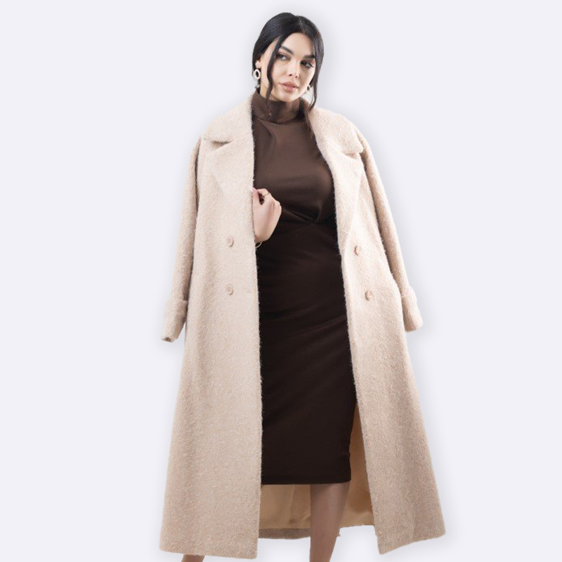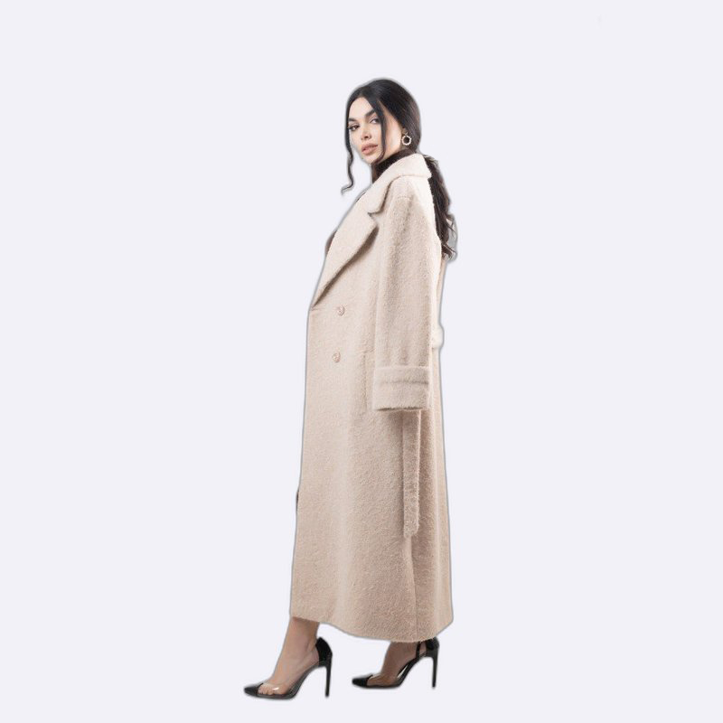 تألقي بأناقة مع هذا المعطف الطويل باللون البيج. تصميم أنيق مع حزام يضفي لمسة جمالية، مثالي لإطلالة شتوية دافئة وعصرية.