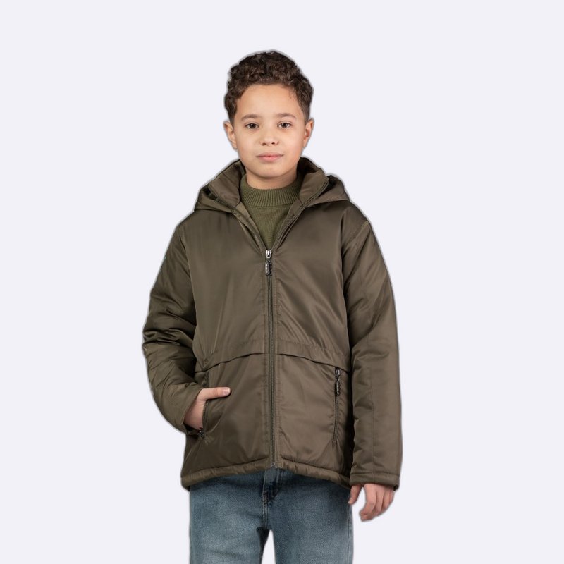 أبقِ طفلك دافئًا وأنيقًا مع هذا الجاكيت المنفوخ بغطاء رأس باللون الزيتوني. تصميم مريح وعصري مثالي للأيام الباردة.