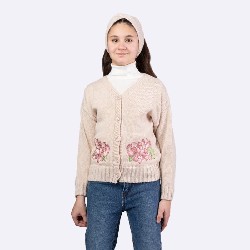 أضيفي لمسة من الأناقة إلى خزانة ملابس طفلتك مع هذا الكارديجان المحبوك الرائع والمطرز بالورود.