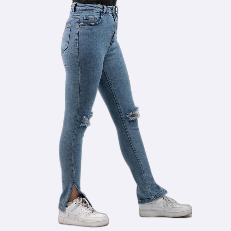 أضيفي لمسة عصرية إلى خزانة ملابسك مع هذا الجينز الأنيق. يتميز بتصميم ممزق عند الركبة وفتحة أنيقة عند الحافة، مما يجعله مثاليًا لإطلالة عصرية ومريحة.