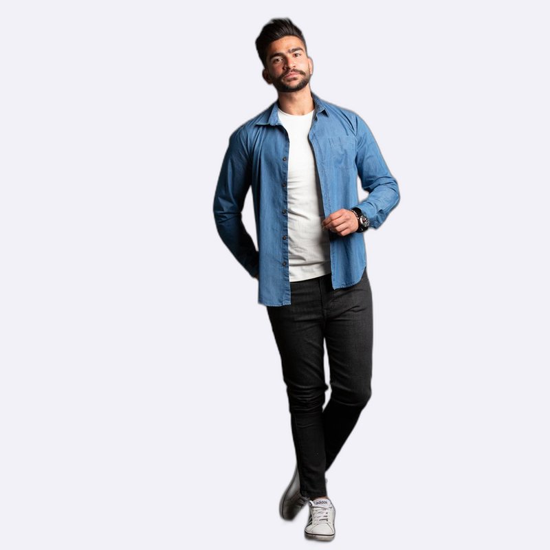 قميص جينز عصري بأزرار أمامية وجيب على الصدر، يتميز بتصميم عملي ومريح.
