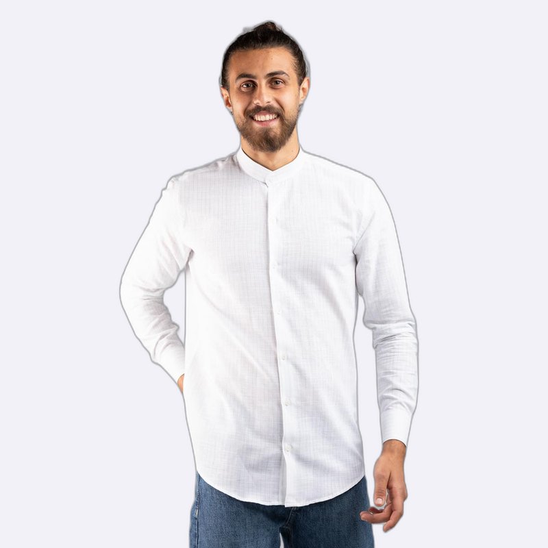قميص كاجوال بأكمام طويلة ونقشة خطوط عمودية رفيعة، يتميز بياقة ماندرين (بدون طية) لمظهر عصري وبسيط.
