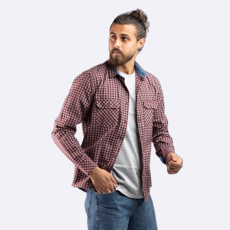 قميص كاجوال بنمط مربعات وأزرار أمامية، يتميز بجيوب مزدوجة وياقة كلاسيكية وتصميم عملي مريح.