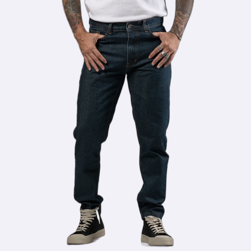 بنطال جينز بلون أزرق داكن وتصميم كلاسيكي، يتميز بخياطة بارزة وجيوب تقليدية، يوفر مظهراً عملياً وأنيقاً يناسب مختلف الإطلالات.