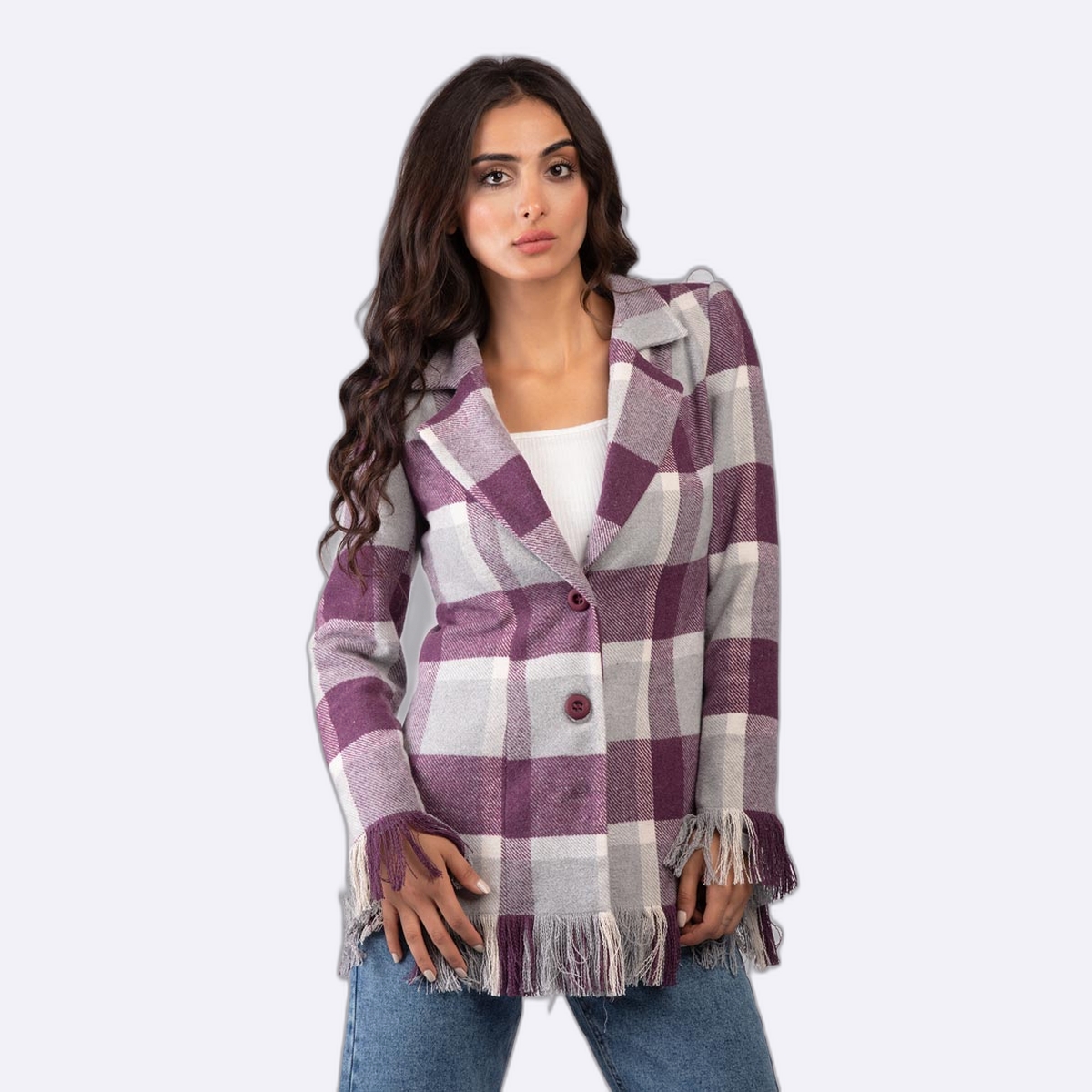 جاكيت بنمط مربعات ومزين بشراشيب عند الأطراف والأكمام