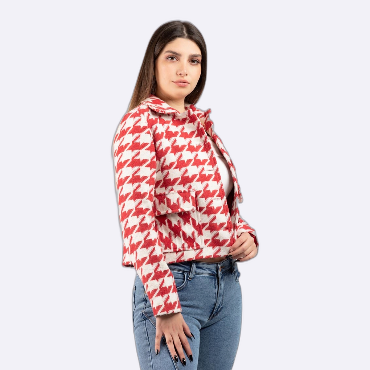 جاكيت بقصة قصيرة مستوحاة من نمط القميص، يتميز بياقة كلاسيكية وصف أزرار أمامي وجيوب صدر كبيرة، ومزين بنمط مربعات عريضة.