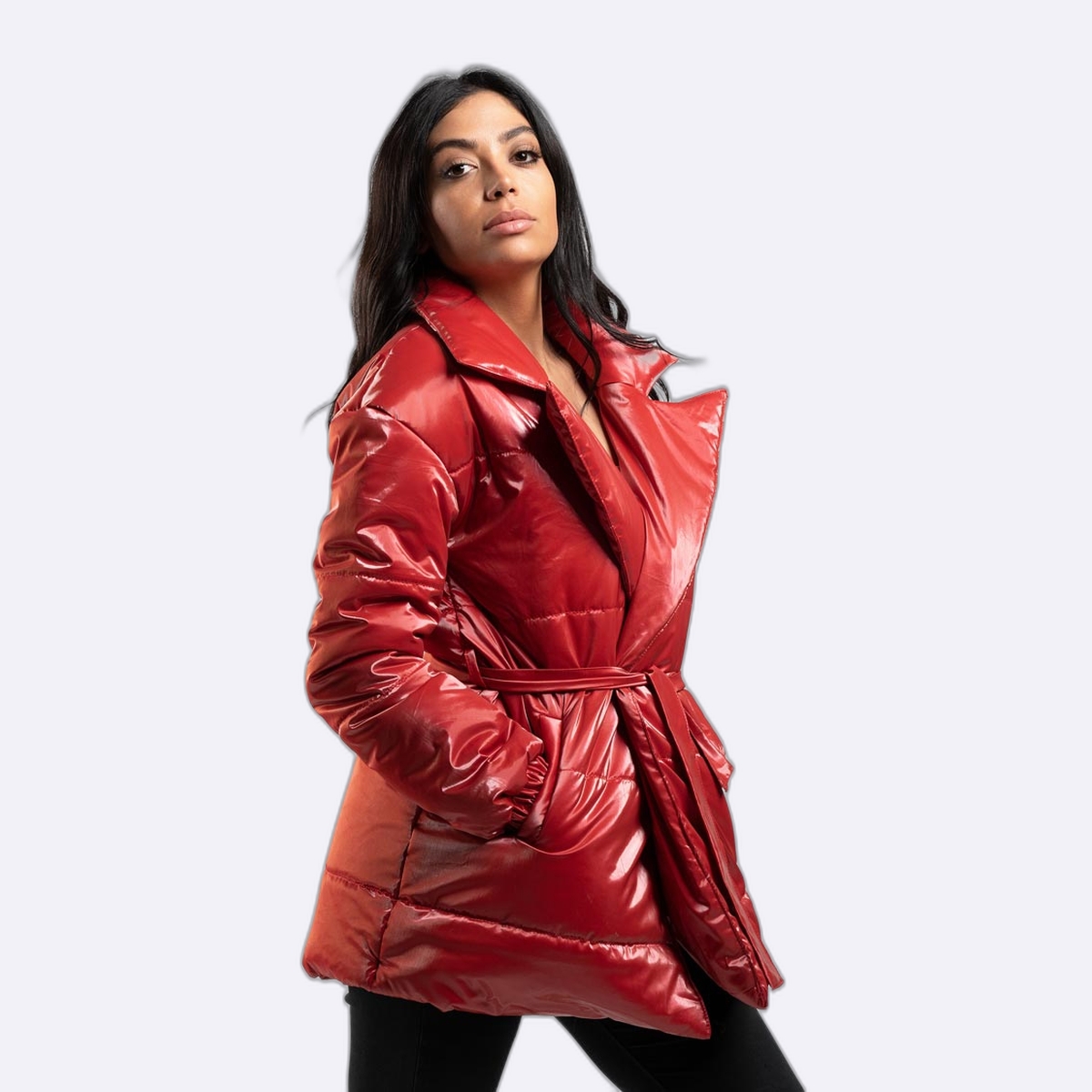 جاكيت منفوخ طويل قليلاً مصنوع من قماش لامع وجذاب، يتميز بياقة عريضة مطوية وأزرار كبس مخفية، ومزود بحزام قماشي عريض لتحديد الخصر