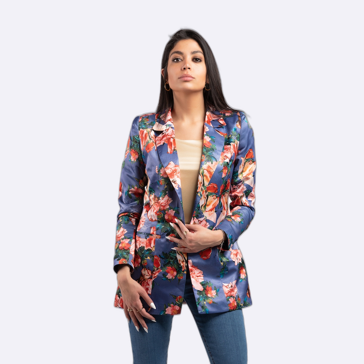 جاكيت بليزر عصري مصنوع من قماش الستان الناعم واللامع، يتميز بنقوش زهور غنية ومتنوعة تغطي كامل القطعة، مع ياقة كلاسيكية مفتوحة وأكمام طويلة