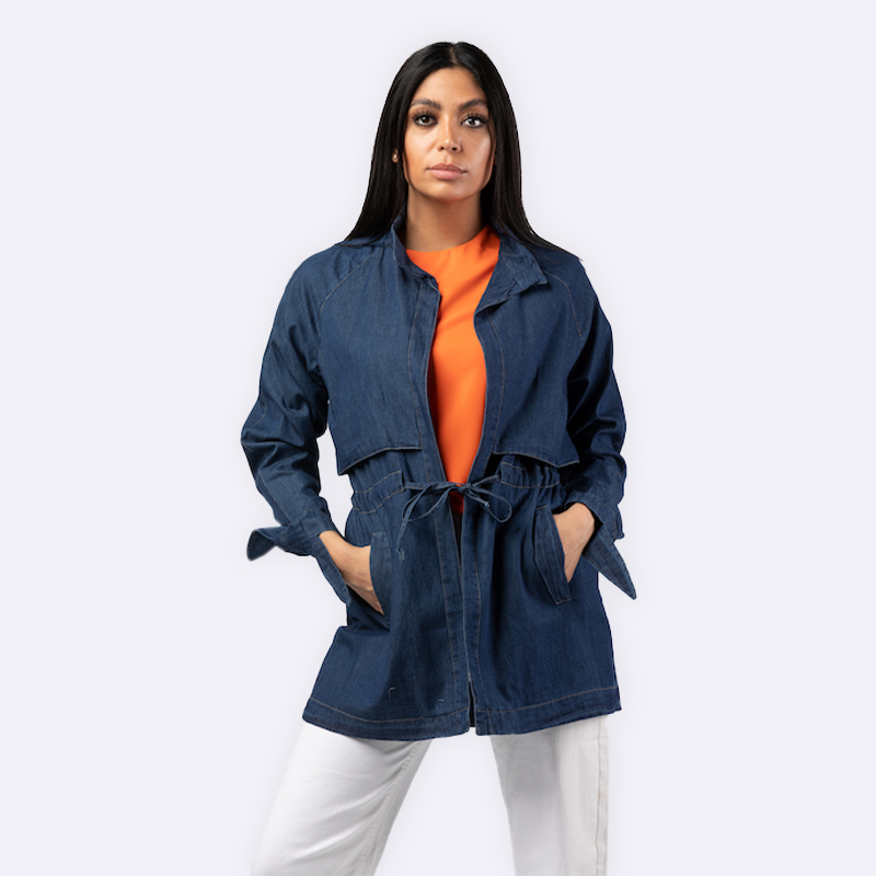 جاكيت مصنوع من قماش الدينيم (الجينز) بتصميم عملي، يتميز بفتحة جانبية على الصدر بأسلوب عصري، ومزود برباط مطاطي عند الخصر لتحديد القوام