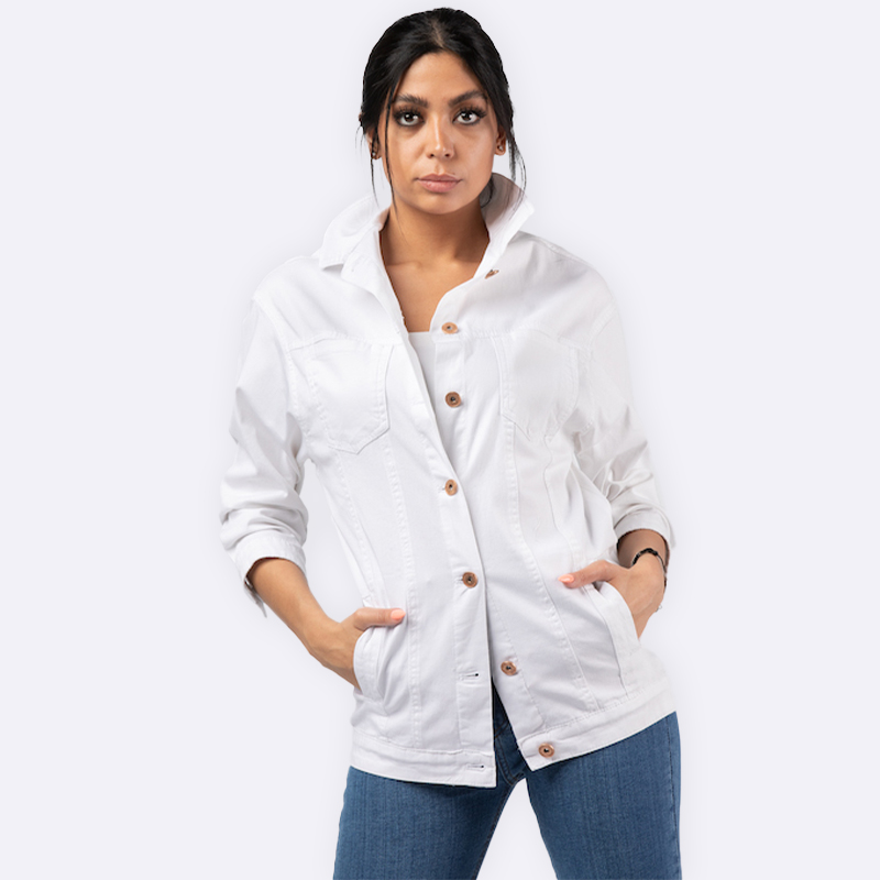 جاكيت جينز بتصميم كلاسيكي خالد، مصنوع من قماش دينيم متين ومريح، يتميز بصف أزرار أمامي وياقة مطوية، وجيوب صدر كبيرة بفتحات عريضة